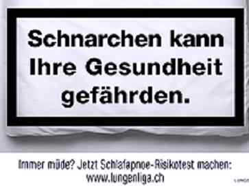 Atemstillstand Das griechische Wort «apnoia» bedeutet Atemstillstand. Atemaussetzer und lautes, unregelmässiges Schnarchen sind denn auch die Hauptmerkmale einer Schlafapnoe. Die Betroffenen erleiden pro Nacht zwischen 50 und mehreren hundert Atempausen. Damit die Atmung wieder einsetzt, kommt es immer wieder zu kurzen Aufwachreaktionen. Daran können sich die Betroffenen jedoch am Morgen nicht erinnern. Sie spüren aber die Folgen der unruhigen Nacht: extreme Tagesmüdigkeit und verminderte körperliche und geistige Leistungsfähigkeit.Extreme Tagesmüdigkeit und Schnarchen sind nicht harmlos Oft wird eine Schlafapnoe nicht als Krankheit erkannt, weil diese noch weitgehend unbekannt ist. Müdigkeit und Schnarchen werden zwar als unangenehm aber nur selten als gefährlich eingeschätzt. In vielen Fällen suchen Betroffene erst nach einem dramatischen Ereignis wie einem Verkehrsunfall wegen Sekundenschlaf eine Ärztin oder einen Arzt auf. Oder die unbehandelte Schlafapnoe verursacht mittelfristig Bluthochdruck und weitere Herz-Kreislaufprobleme. Die Lungenliga klärt mit einer schweizweiten Kampagne über die Krankheit auf. /