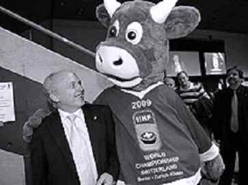 Er hoffe allerdings, dass die Schweizer die Notration nicht brauchen müssen, scherzte Maurer. Bundesrat Ueli Maurer kann sich auf den Beistand des WM-Maskottchens Cooly verlassen. /