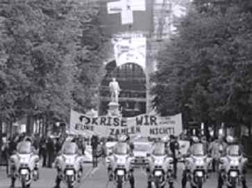 ![]() Im offiziellen Umzug waren laut Stadtpolizei auch rund 400 Personen, welche der linksautonomen Szene zuzuordnen seien. Gegen Abzock-Manager Stadt- und Kantonspolizei Zürich sind mit einem grösseren Aufgebot in der ganzen Innenstadt präsent. Thematisch richtete sich der von Musik untermalte Protestzug gegen Lohnexzesse von Managern und den Abbau von Arbeitsplätzen - oder in den Worten eines Demonstrationsteilnehmers: «Gegen die Krise, für Jobs und soziale Sicherheit.» Das offizielle Motto der Kundgebung lautete: «Eure Krise zahlen wir nicht!» Beim Vorbeizug des Tross' an der Uraniawache der Stadtpolizei Zürich wurde über Lautsprecher ein Stück eines Rappers verbreitet, in dessen Textzeile es unter anderem hiess: «Polizischte händ in Züri Ruhe, Polizischte händ in Züri nüüt z' tue.» Vereinzelt war die Detonation von Knallkörpern zu hören. Gegen 12.30 Uhr erreichten die Demonstranten den Bürkliplatz, wo die Schlusskundgebung stattfand. Neben Reden der Berner Gemeinderätin Regula Rytz, des Stiller-Has-Künstlers Endo Anaconda und der argentinischen Philosophin Isabel Rauber, sprach auch Paul Rechsteiner, Präsident des Schweizerischen Gewerkschaftsbundes (SGB) und SP-Nationalrat zum Volk.