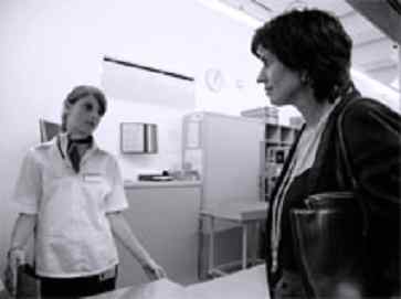 Doris Leuthard spricht während eines Rundgangs durch die Poststelle am Bärenplatz mit Post-Lehrling Sandra Wenger. / Foto: EQ Images