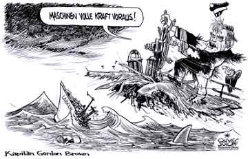 Der Held im brownen SumpfGordon Brown gehört zu jener Sorte Kapitän, die nicht nur als letzte von Bord gehen, sondern sogar irgendwie noch auf der Brücke stehen, wenn das Kahn längst gesunken ist.Quelle: Nebelspalter / Dienstag, 9. Juni 2009 / 00:37 h