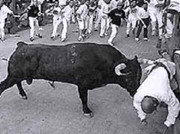 Juli jeden Morgen sechs Kampfstiere und sechs zahme Leitochsen durch die Gassen der Altstadt bis in die Arena gejagt, wo sie abends von Toreros getötet werden. Hunderte wagemutige Männer, die «mozos», rennen auf der 825 Meter langen Strecke vor den Tieren her. Als einzige «Waffe», um die Bullen von sich fernzuhalten, ist eine zusammengerollte Zeitung erlaubt. Die Hatz («encierro») war durch Ernest Hemingways Roman «Fiesta» (1926) weltbekannt geworden. Seit 1924 kamen 14 Läufer ums Leben, zuletzt starb 2003 ein Mann. Tierschützer kritisieren die Hatz auch als Tortur für die Stiere.