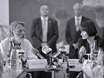 ![]() Ex-Geisel Werner Greiner und Bundesrätin Micheline Calmy-Rey an der Medienkonferenz im Flughafen Unique. /