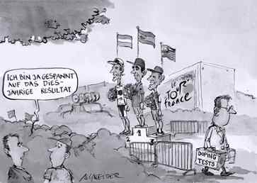 Tour de France: Warten auf das SchlussklassementEntgegen entsprechenden Meldungen aus Paris vom Sonntag ist die Tour de France noch lange nicht zu Ende.Quelle: Nebelspalter / Dienstag, 28. Juli 2009 / 22:57 h