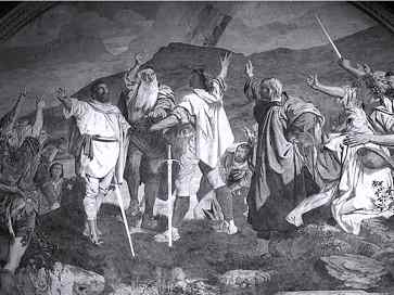 Wandgemälde in der Tells-Kapelle zwischen Sisikon und Flüelen am Vierwaldstättersee: Darstellung des «Rütlischwurs» (1291 n.C.). / Foto: David Adair ex-press.ch