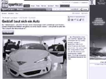 ![]() Ausriss aus der «Autobild»: Libyens «Auto der Zukunft» ist 5,5 Meter lang, hat 230 PS und kostet so um die 2 Mio. Euro. /