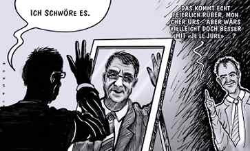 Schwaller verschwört sichSiegessicher feilt die Christlichdemokratische Volkspartei (CVP) an den letzten Details für die Bundesrats-Ersatzwahl.Quelle: Nebelspalter / Sonntag, 13. September 2009 / 16:50 h