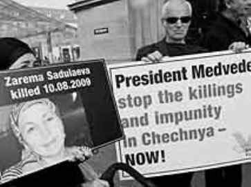 ![]() Demonstranten erinnern vor der Heiliggeist-Kirche an die ermordeten Menschenrechtsaktivistinnen Sarema Sadulajewa und Natalia Estemirowa und die Journalistin Anna Politkowskaja. /