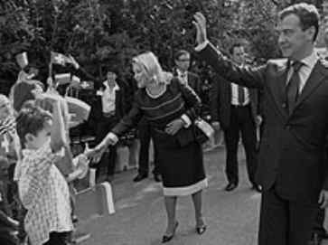 ![]() Dmitrij und Swetlana Medwedewa werden in Kehrsatz von einer Schulklasse begrüsst. /