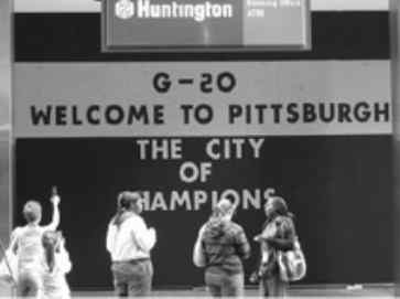 ![]() Heute treffen Vertreter der wichtigsten Industrie- und Schwellenländer in Pittsburgh zusammen. Plakat an der Ecke 7th und Smithfield Avenue.