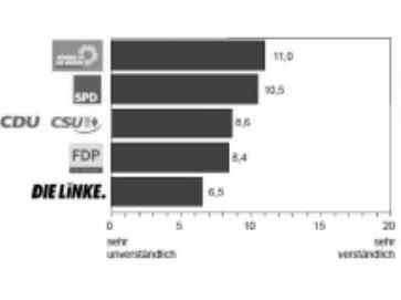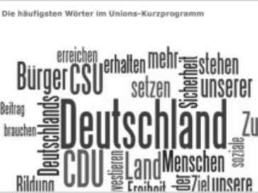 Linke fällt durch «Ohne ein hohes Bildungsniveau oder politisches Fachwissen sind die Inhalte der Bundestagswahlprogramme für die Wählerinnen und Wähler nur schwer zugänglich.» «Die Links-Partei hat dabei das formal unverständlichste Bundestagswahlprogramm. Es ist nicht sehr viel leichter zu lesen als eine Doktorarbeit in Politikwissenschaft», heisst es in der Studie. Die Grünen verwenden dagegen die verständlichste Sprache – d.h. kurze Sätze mit wenig Schachtelsätzen.Am häufigsten verwendete Begriffe: Die Union aus CDU/CSU setzt auf die «Deutschland-Karte. /