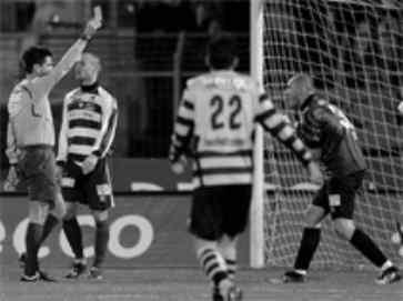 ![]() Schiedsrichter Claudio Circhetta zeigt Bellinzonas Torhüter Carlo Zotti die rote Karte. /
