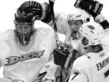 Gratulation von den Kollegen: Jonas Hiller von den Anaheim Ducks wehrte 36 Schüsse ab. (Archivbild) / Foto: EQ Images