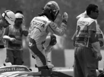 Jarno Trulli entsteigt dem Boliden von Toyota nach einem Crash beim GP von Spanien. /