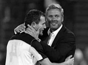 «Wenn du zufrieden bist, bleiben die Resultate aus» Der Stürmer lässt sich lange Zeit, bevor er seinen Gedanken zu Ende ausspricht. Trotz aller Offenheit, die ihn auszeichnet, hat die Erfahrung ihn gelehrt, seine Worte vorsichtig zu äussern. Also, nötig sich aufzuregen? «Wenn du zufrieden bist, bleiben die Resultate aus. Natürlich möchte ich alle Erfolge mit den Fans feieren, aber ich kann nicht immer. Zum Beispiel, wenn man sich für den Cup-Viertelfinal qualifiziert, hat man nichts. Man ist nur im Viertelfinal.» «Ich bin nicht immer unzufrieden», versichert er mit einem Lächeln im Gesicht. «Manchmal spiele ich den Unzufriedenen.Alex Frei (links) könnte Thorsten Fink heute wieder ein Lächeln auf den Mund zaubern. /