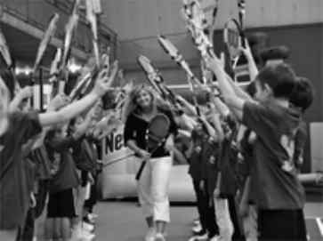 ![]() sich allesamt durch den Gewinn eines Kids-Tennis-Turniers qualifiziert hatten und dann ausgelost worden waren. Bacsinszky spielte mit ihnen, beantwortete Fragen, posierte geduldig für Fotos und schrieb unzählige Autogramme.