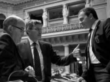 ![]() «Die Neutralitätsforderung an den Staat und seine Organe impliziert keine differenzlose Gleichmacherei der Religionen.» Anti-Minarett-Initiant Walter Wobmann, rechts, erhält Gratulationen von Christian Miesch und Pirmin Schwander. /