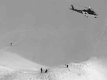 ![]() Helfer suchen nach den Vermissten des Lawinenunglücks, während ein Rega-Helikopter das Gebiet «Chummli» im Diemtigtal im Berner Oberland verlässt. /