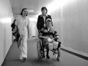 Tanja Frieden wird mit den Rollstuhl an die Pressekonferenz gefahren. / Foto: EQ Images