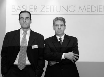 Ohne Aktien im Verwaltungsrat Neben der schweren Krise sei vor allem dieser Wandel eine Bedrohung für das Geschäftsmodell der regionalen Tageszeitung, sagte Hagemann. Inserate wanderten ins Netz ab. Dort konkurrenzierten auch Inhalte die Abozeitungen. Gratisblätter kämen hinzu.Matthias Hagemann, bisheriger Verwaltungsratspräsident der Basler Zeitung Medien BZM, und der Basler Medienanwalt und neue Verwaltungsratspräsident Martin Wagner. /
