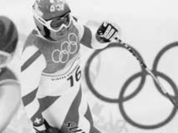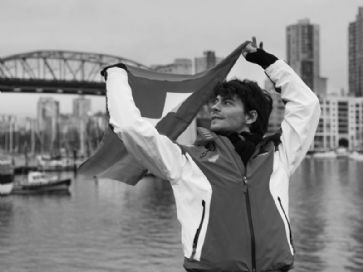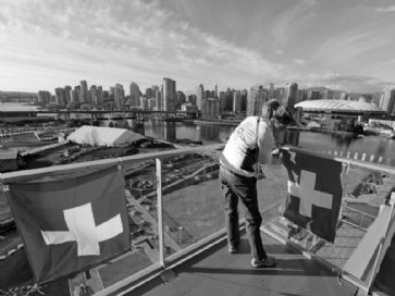 Stephane Lambiel tanzt mit der Schweizer Fahne vor der Skyline von Vancouver. / Foto: EQ Images