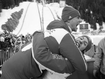 ![]() Trainer Martin Künzle freut sich mit Simon Ammann nach dem Gewinn der Goldmedaille. /