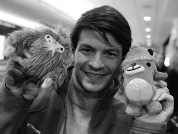![]() Stephane Lambiel posiert mit den beiden Maskottchen Quatchi und Mukmuk bei seiner Ankunft am Flughafen in Vancouver. /