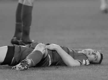 Oberarmbruch: Alex Frei liegt nach dem Zusammenprall am Boden. / Foto: EQ Images
