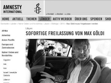 ![]() Darüber hinaus verletzte das Gerichtsverfahren international geltende Standards. Max Göldi ist das Opfer einer politisch motivierten Anklage geworden. Amnesty International betrachtet ihn als Gewissensgefangenen. Verlangen Sie die sofortige Freilassung und die Rückkehr von Max Göldi in die Schweiz.» Mit dem Namen gerade stehen Mit diesem aussagekräftigen Beitrag möchte Amnesty International auf ihrer Homepage Max Göldi unterstützen und für seine Freiheit kämpfen. Wer die Aktion unterstützen will, muss seinen Namen angeben. Laut dem Pressesprecher der Menschenrechtsorganisation Amnesty International, Daniel Graf, drückt die Angabe des Namens die Stärke dieser Aktion aus und macht die Botschaft die der libyschen Behörden übermittelt wird persönlicher, wie er gegenüber der «Migros-Zeitung» erklärte.Links zum Artikel: