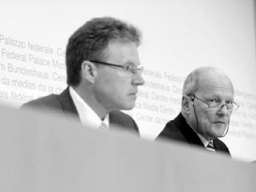 Andreas Meyer, CEO SBB, und Max Friedli, Direktor BAV, orientieren an der Medienkonferenz zum Stand der Bahn 2030. /