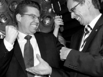 ![]() Give-me-five-Freude bei Andreas Rickenbacher (SP) und Hans-Jürg Käser (FDP) über die Wiederwahl. /