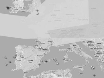 Online-Darstellung des europäischen Luftraums - inklusive Aschewolke. (8:42:51 UTC) / Screenshot: radarvirtuel.com