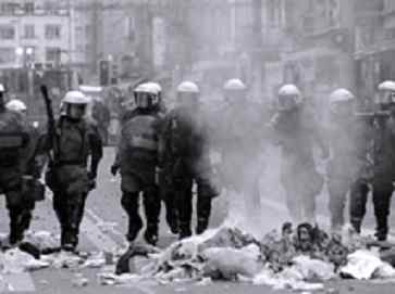 ![]() Vermummte Krawallmacher setzten Abfallkontainer und andere Gegenstände in Brand und warfen Steine, Molotow-Cocktails sowie Flaschen und andere Gegenstände gegen die Polizei. /