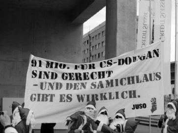 «Lohn von 2225 Verkäuferinnen» Der Abstimmung ging eine heftige Redeschlacht voraus. «Was tut Herr Dougan eigentlich, für nur 3 Tage Arbeit jeweils eine Million Franken zu bekommen?», fragte ein erboster Kleinaktionär. 2225 Schweizer Verkäuferinnen müssten ihre Löhne zusammenlegen, um Dougans Gehalt zu egalisieren. Noch krasser ist sein Vergleich im weltweiten Massstab: 500'000 Näherinnen müssten in der Dritten Welt unter miserablen Umständen arbeiten, um Dougans Lohn zu erhalten. 3 Millionen Menschen seien von dieser Summe abhängig. «Das ist allergrösstes Schmarotzertum», sagte der Kleinaktionär zu Dougans Lohn. Dougan erhält für 2009 rund 19 Mio. Fr. Lohn, der grösste Teil davon als Bonus.Brady Dougan Brady stand arg in der Kritik. /
