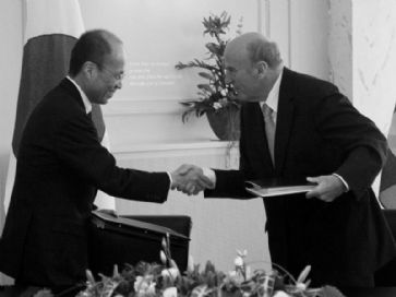 Icharo Komatsu, der japanische Botschafter in der Schweiz und der Bundesrat Hans-Rudolf Merz. /