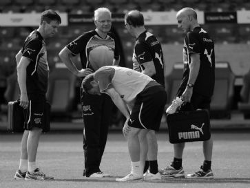 ![]() Betreuer kümmern sich um den verletzten Alex Frei. /
