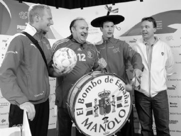 Marco Padalino, Spanien-Fan Manolo, Stefan Lichsteiner und Fabian Furrer Co-OK-Praesident Bergdorf-EM 2012 posieren für die Fotografen. /