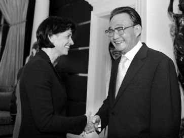 Doris Leuthard begrüsst Wu Bangguo im Dolder Grand Hotel in Zürich. /