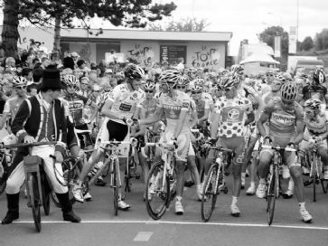 ![]() Alberto Contador (in Gelb), Andy Schleck (in Weiss), Anthony Charteau (im Bergleader-Trikot)und Allessandro Petacchi (in Grün)am Start zur letzten Etappe. /