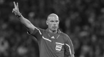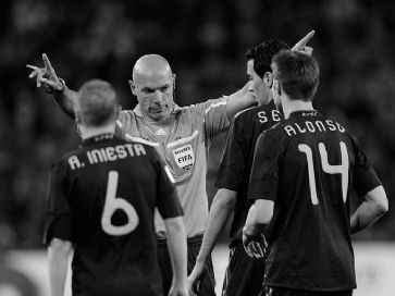 Vor allem bei den Spaniern, denen das brutale Spiel der Holländer aufgezwungen wurde, stiess die Busse auf Unverständnis. Bild: Schiedsrichter Howard Webb überfordert im Final. /