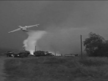 Ein Löschflugzeug im verzweifelten Kampf gegen die Feuerwalze. /