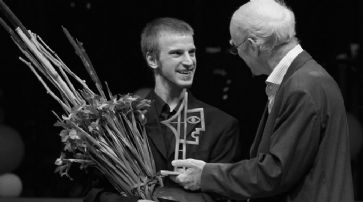 Juryleiter Franz Hohler (r) gratuliert Marc Hofmann. /