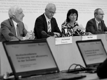 Erster Präsident von Microsoft Erster Präsident des Boards ist Peter Waser, Generaldirektor von Microsoft Schweiz. Auf die Frage, ob der Softwaregigant der richtige Partner sei, sagte Leuthard, das Gremium stehe weiteren Interessenten offen.Willy Zwaenepoel, Professor an der EPFL Lausanne, Peter Waser, Bundespräsidentin Doris Leuthard und Eric Scheidegger, stellvertretender Direktor des Seco, präsentieren das E-Economy-Board. /