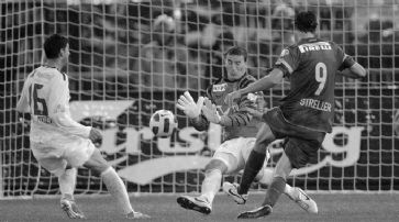 Resultate: FCZ - FCB 1:4 (0:2). St. Gallen - Luzern 1:2 (0:2). Rangliste: 1. Luzern 9/20. 2. Basel 10/18. 3. Zürich 9/14. 4. Sion 8/12. 5. Thun 9/12 (15:13) 6. YB 9/12 (10:11). 7. Bellinzona 9/12 (14:18). 8. Basels Samuel Inkom erzielt gegen Zürichs Alain Rochat das Tor zum 0:1. / Foto: EQ Images