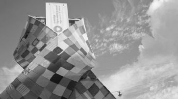 Zwölf Meter hohe rosa Schleife aus gestrickten Quadraten. /