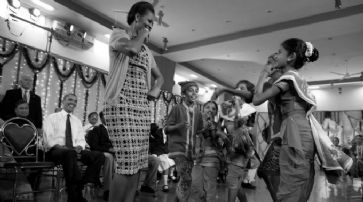 Michelle tanzt mit Schülern der Holy Name High School in Mumbai. /