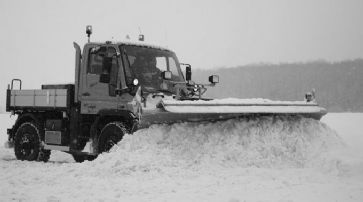 Schneepflüge räumen den Schnee von der Landebahn. /