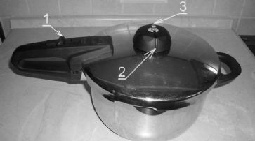 Dampfkochtopf: 1: Griff/Entrigelung, 2: Druckeinstellung, 3: Wo Mubarak drauf sitzt /