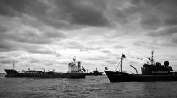 Schiff von Sea Sheperd stört die Walfangflotte. /