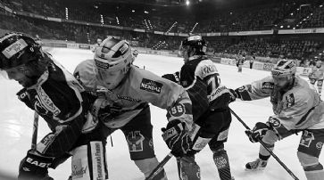 Bossard. -- 6315 Zuschauer. -- SR Reiber/Peer, Fluri/Müller. -- Tore: 4. Duri Camichel (Fabian Lüthi, Di Pietro) 1:0. 19. Walsky (Paul Savary, Pothier) 1:1. 22. Rubin (Walsky, Bezina/Ausschlüsse Rossi, Damien Brunner) 1:2. Umkämpftes Spiel in Zug: Thomas Rüfenacht und Sven Lindemann (ZUG) gegen Daniel Vukovic und Goran Bezina (GENF). / Foto: freshfocus